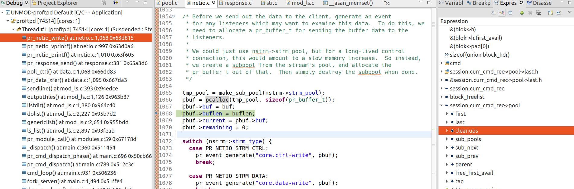 ASAN_OPTIONS=verbosity=3,detect_leaks=0,abort_on_error=1,debug=true,check_initialization_order=true,detect_stack_use_after_return=true,strict_string_checks=true,detect_invalid_pointer_pairs=2 ./proftpd -n -c basic.conf -d 10 -X - Run a netcat listener on port 1055 (PORT 127,0,0,1,4,31 in our PoC).